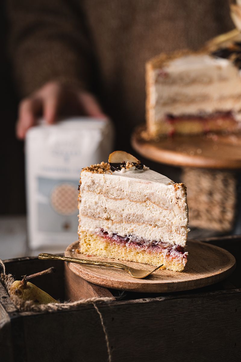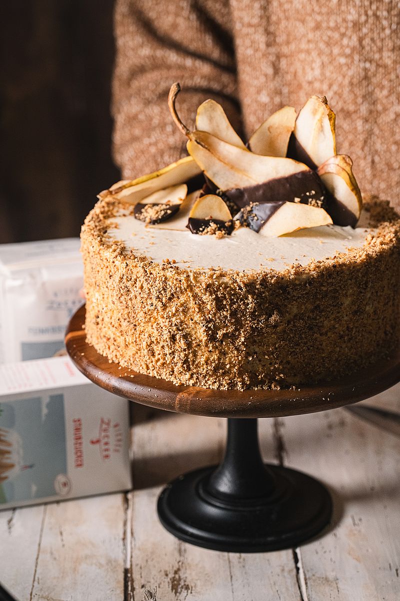 10. Dort potřete zbývajícím krémem a ozdobte praženými lískovými oříšky a plátky čerstvých hrušek.