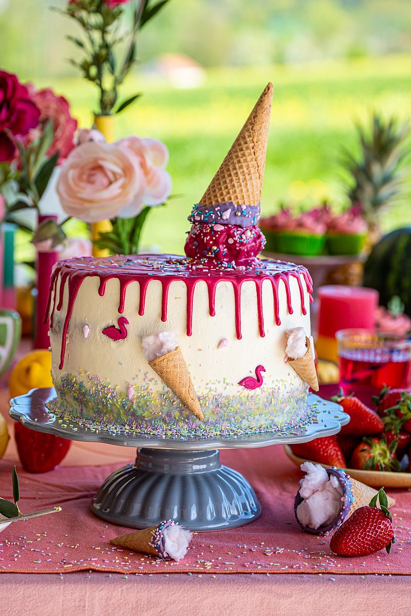 Ze zbytků korpusu, smetanového sýra a moučkového cukru vytvořte kouli o velikosti vhodné do kornoutu. Položte ji na dort. Polijte kouli polevou, poté polevu naneste na vršek dortu a nechte stékat po stranách. Ihned posypte cukrovými perličkami a zapíchněte kornout na kouli.